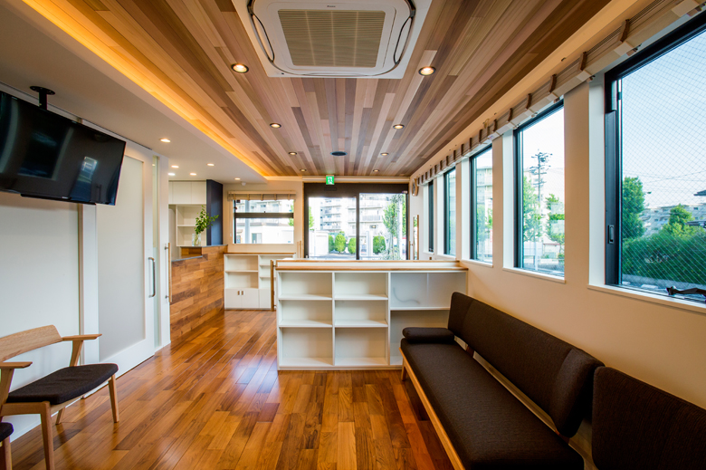 そこで、玄関と待合では天井と床に無垢材を使用し、外部の緑や景色を取り込むように開口部を配置しました。ナチュラルで開放感のある空間で、患者さんが落ち着いて過ごせるよう計画しています。